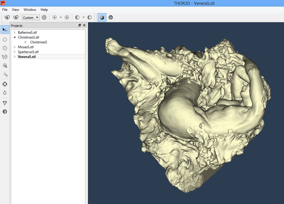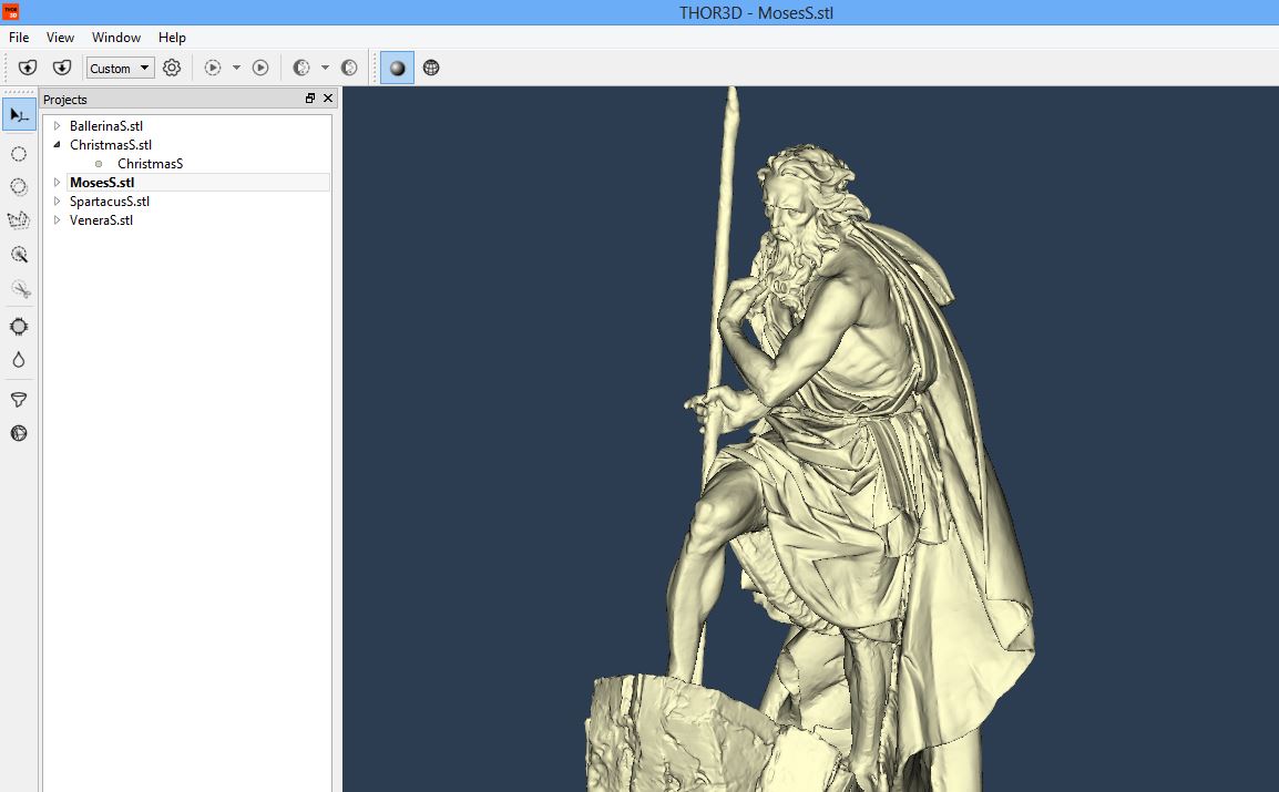 Scanning took about 2.5 hours (about 30 minutes per sculpture). We brought our laptop with us, so after scanning the first statue, we got the post-processing going simultaneously. By the time we left, 3 out of the 5 statues were completed. Truth be told, the battery died about half way through the process (Drake’s battery lasts about 90 minutes), but since scanning was done indoors, we just plugged the scanner into the nearest outlet and finished the job. Back in the office, we finished post-processing for the last two sculptures and simplified all of them because such high resolution wasn’t needed. We reduced the file size by about half and “Moses” was the largest of the files by far. Four out of the five sculptures were around 200MB before simplification and about 100MB after (Moses was 400MB before and 200MB after).