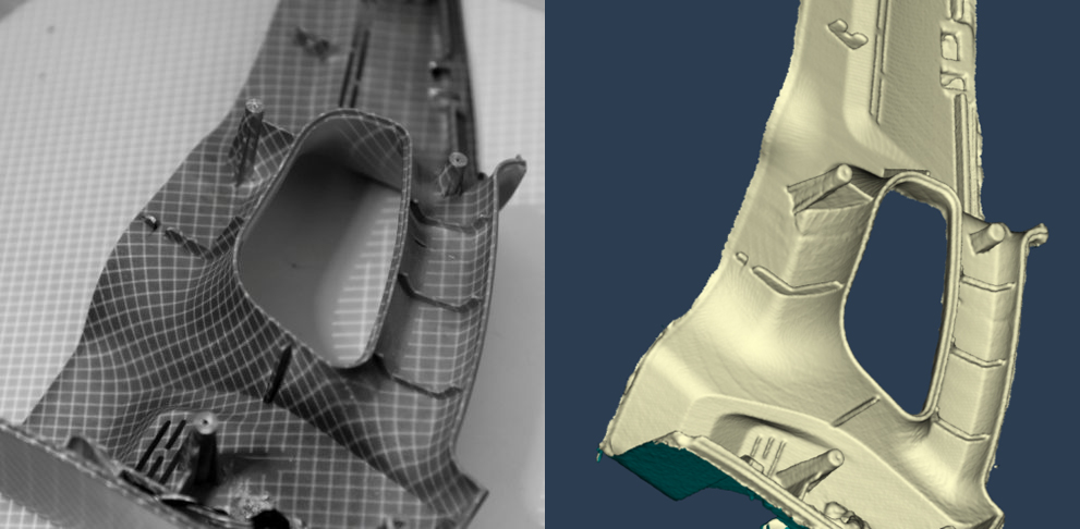 Second of all, 3D scanner Drake uses its combination of 2 cameras and 2 projectors in a unique way. Although this method can work well with just one camera, we’ve added a second camera just to gather more data quicker (side note: there is actually a third camera in Drake, but it’s used exclusively to capture texture and not geometry). So, two sets of lines are projected (one vertical, one horizontal) and seen by the cameras simultaneously, allowing for faster reconstruction of sharp edges. Moreover, the two projectors are used to get more information on the intensity of the projected pattern, as well as, the intensity of the joints (where the two lines intersect). This method works best, when one projector projects one set of stripes for rough reconstruction and the second projects for refined reconstruction, as opposed to using one projector for the whole grid.