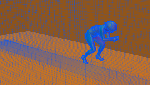 a) The first step is to create the mesh of the fluid domain. The hexahedral (six-sided cells) constructed mesh will represent a virtual wind tunnel (from the outside of the rider to the walls of the tunnel). To improve the effectiveness of the analysis, a hexahedral mesh is favored over a tetrahedral (pyramidal) mesh. This step requires good geometry because inverted cells and internal features could cause meshing problems.